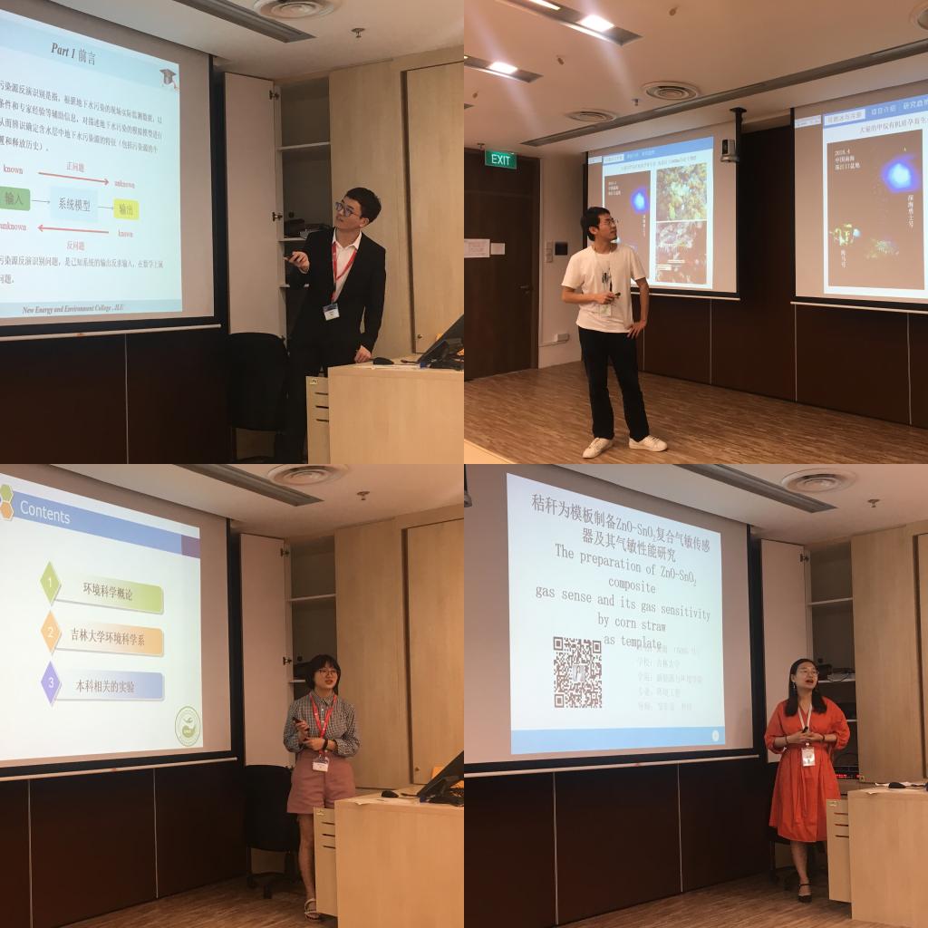 的四位硕士生吴红君、龚雨、白玉堃和魏子麟同学分别介绍了自己的研究成果,包括大气颗粒物的采集与污染物测定、仿生学在环境中的应用、卡尔曼滤波法在地下水污染源反演识别中的应用,还有可燃冰和海底冷泉形成的相关知识。