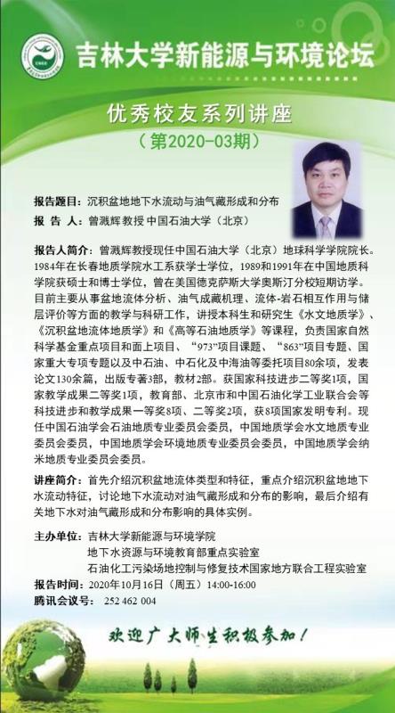 讲座简介:首先介绍沉积盆地流体类型和特征,重点介绍沉积盆地地下水流动特征,讨论地下水流动对油气藏形成和分布的影响,最后介绍有关地下水对油气藏形成和分布影响的具体实例。