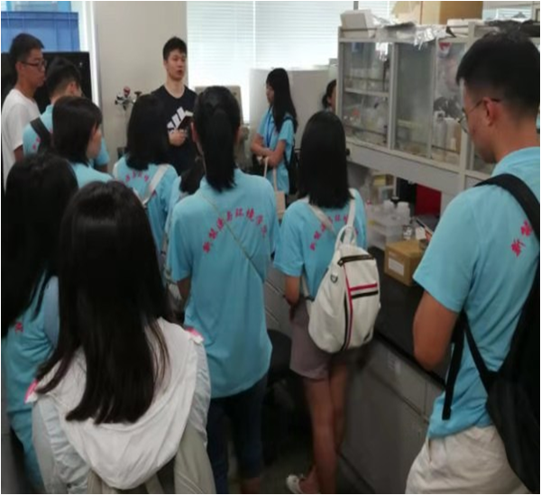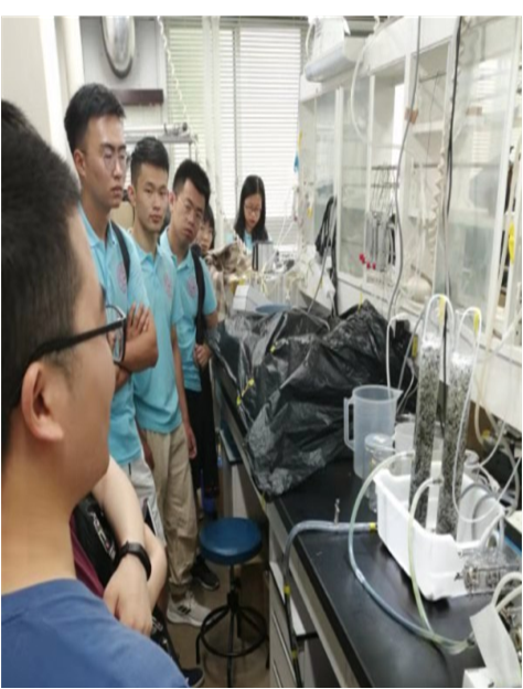 筑波大学是一所以研究型为主的大学,接下来同学们就来到了筑波大学生命环境科学研究科张振亚教授和累中方教授研究团队的实验室,感受一下筑波大学的研究氛围。张振亚教授和累中方教授研究团队是筑波大学非常具有实力的团队,研究方向主要为水污染物处理、有机废弃物能源化等。曾培养出数十名优秀的中国博士和硕士留学生,发表了多篇环境科学与工程领域的顶级论文,连续多年获得筑波大学毕业生校长表彰。实验台上摆满了学生们的实验用品,这里的实验用品跟国内不同,筑波的学生们将藻类做成了各种颗粒,这样便于储存。下图中同学们正在观察的装置就是藻颗粒菌颗粒共存处理污水的装置,这样可以由藻类光合作用给菌类提供氧气,从而使这个装置可以不需要从外部接受氧气。筑波的中国留学生们不仅对实验室进行了详细的介绍,还给同学们介绍了在筑波大学的留学生活,也让学院师生对筑波大学有了更多的了解。