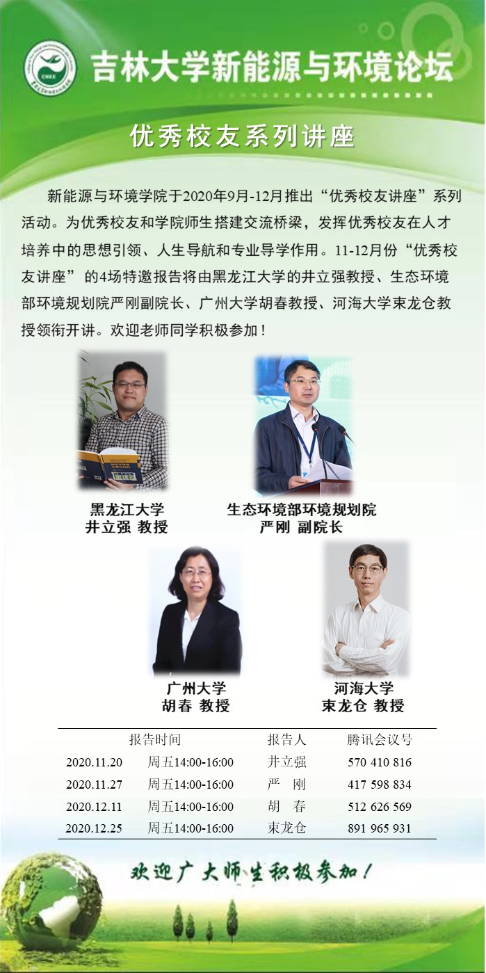 嗨皮漫画 于2020年9月-12月推出“优秀校友讲座”系列活动。为优秀校友和学院师生搭建交流桥梁,发挥优秀校友在人才培养中的思想引领、人生导航和专业导学作用。11-12月份“优秀校友讲座” 的4场特邀报告将由黑龙江大学的井立强教授、生态环境部环境规划院严刚副院长、广州大学胡春教授、河海大学束龙仓教授领衔开讲。欢迎老师同学积极参加!