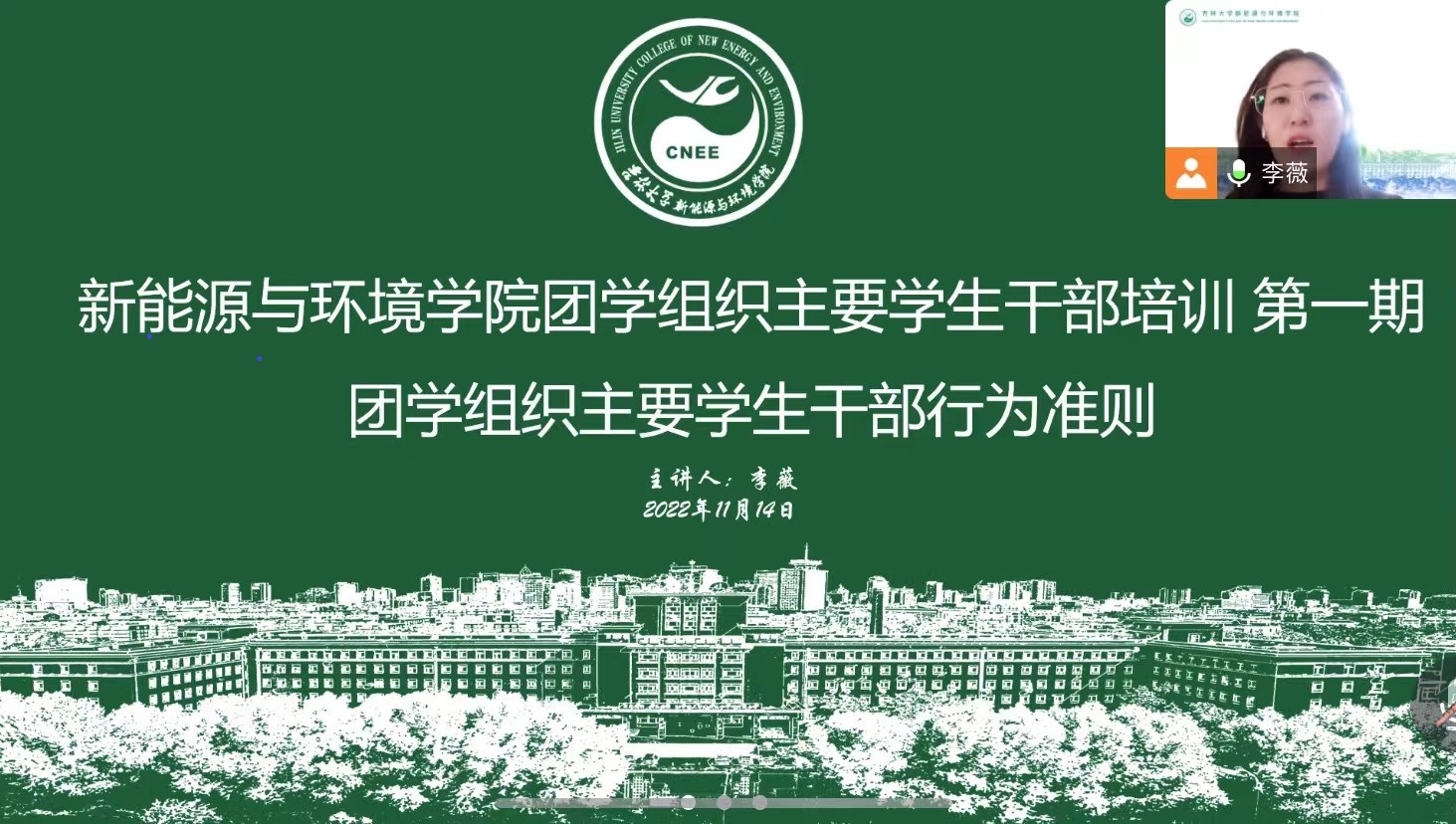 第五届团学组织主要学生干部组成,第一期培训课程为团学组织主要学生干部行为准则,主讲人为学院团委负责人李薇老师,结合学院两校三地办学实际,培训通过线上腾讯会议的方式进行。