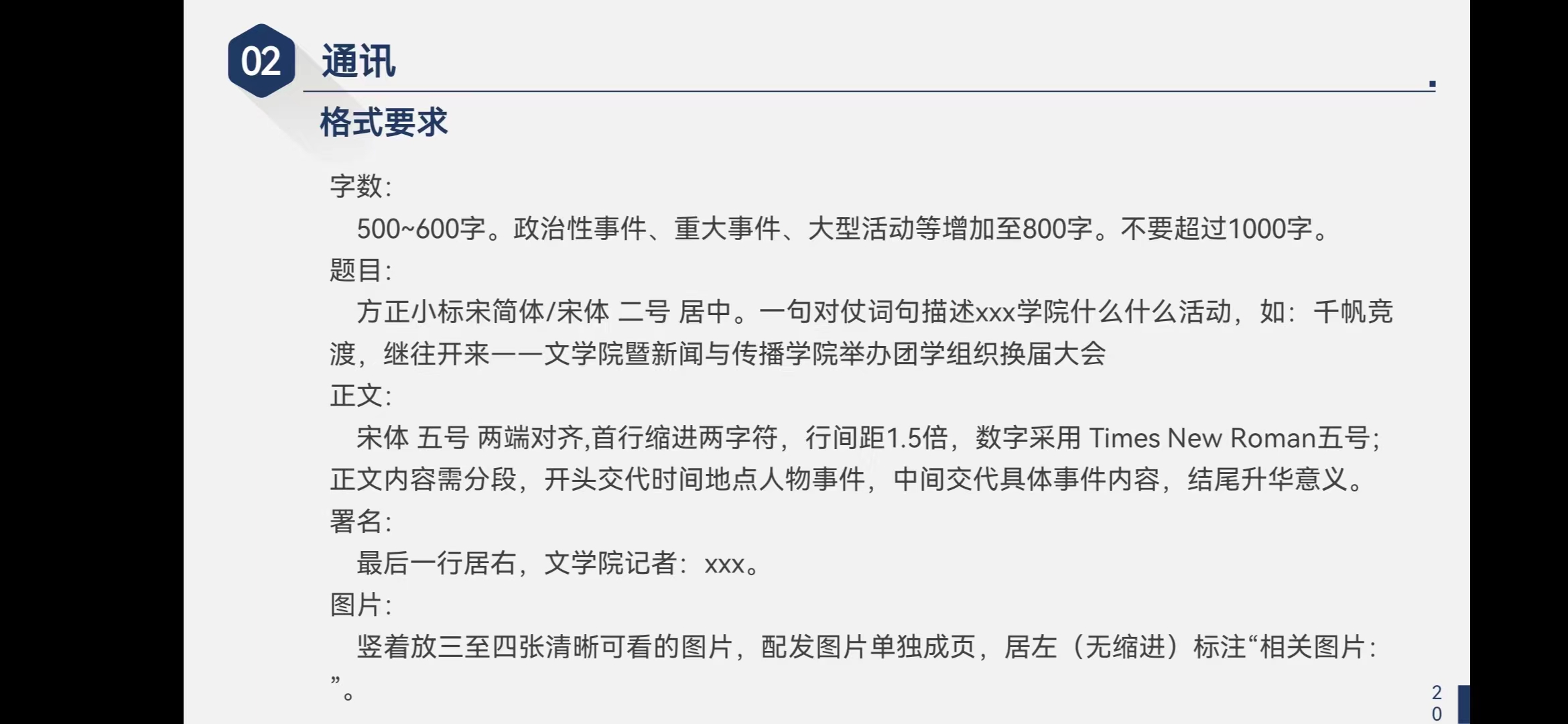 会上,陈实同学由表及里、层层递进,从通讯的定义开始,到标题的对仗、内容的详实、结尾的升华,为同学们详细介绍了一篇完美的通讯稿是如何形成的。陈实同学也结合了她的工作经历,分门别类的向我们讲述了不同类型与主题的活动适配怎样的文风,以及有哪些不同的注意要点。