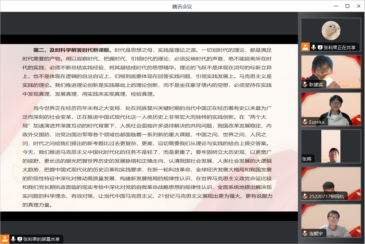 首先,由团支书在腾讯会议上进行屏幕共享,带领大家共同阅读学习《习近平:开辟马克思主义中国化时代化新境界》一文。该篇文章从四点展开讲述,分别是“始终坚守理论创新的魂和根”、“及时科学解答时代新课题”、“着力推进党的创新理论体系化学理化”和“注重从人民群众的创造中汲取理论创新智慧”,全面详细地介绍了习主席在开辟马克思主义中国化时代化新境界方面提出的四点要求。
