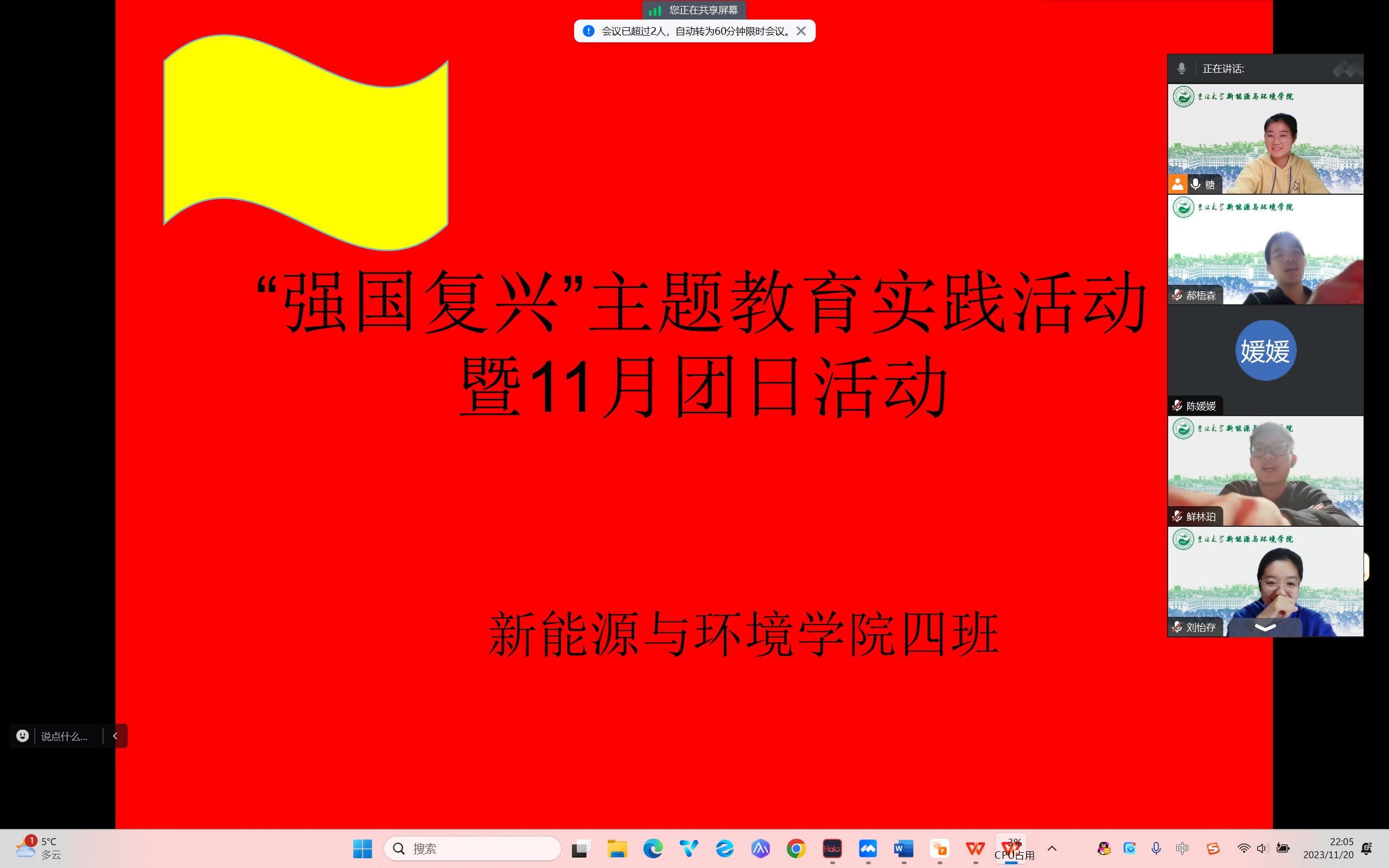 252304班团支部于十一月二十日晚六点在团支书唐烨的带领下开展“强国复兴”主题团日活动。此次活动共有包括团支部内25名共青团员在内的36位青年参加。