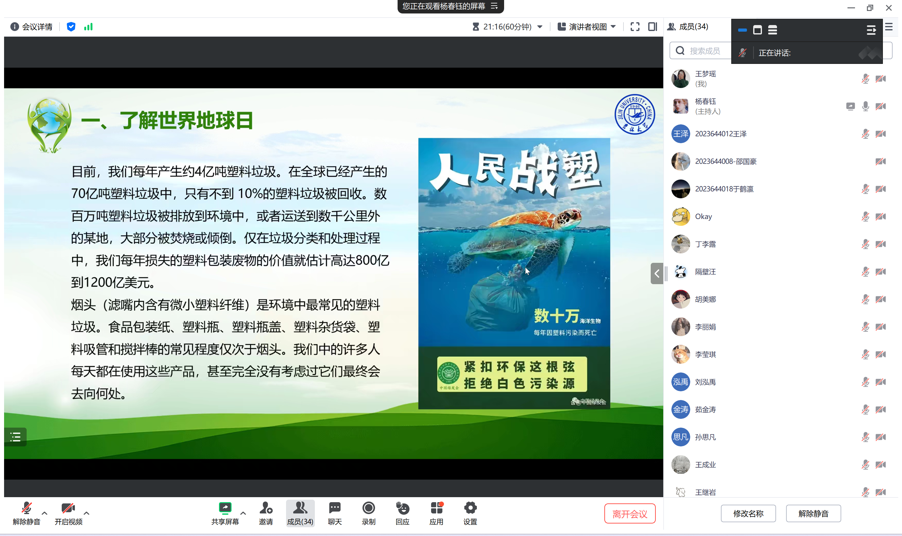 2021级同学卫文轩同学谈到““白色污染”正是构成目前城市污染的重要污染源之一,带来了长久的危害,美丽的自然不断在退化,我们的健康也受到了威胁。为减少塑料袋的使用,保护我们共有的家园,还原一片蓝天和一方净土我们每个人都应该积极行动起来,彻底改变使用塑料袋的这种习惯,共创和谐美好家园。”