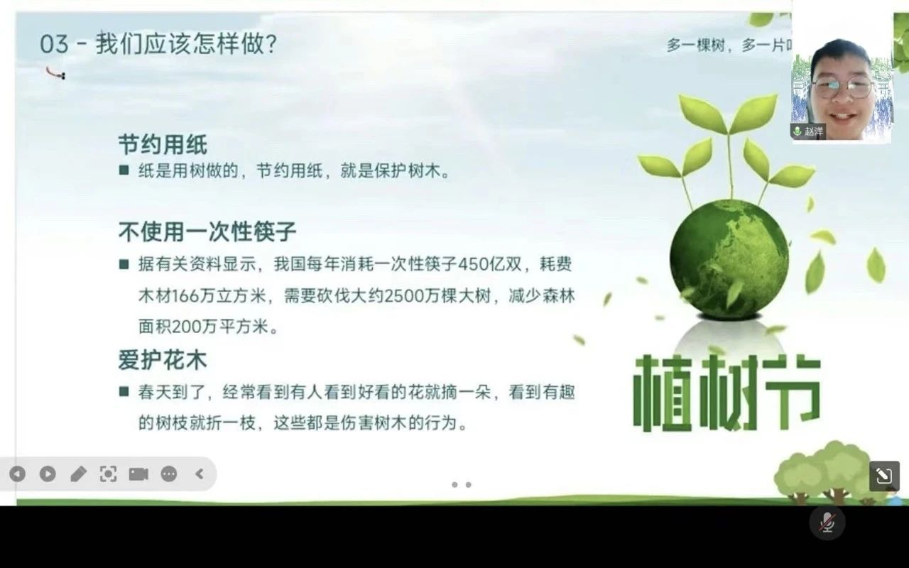 252227团支部在会议中放映了绿色环保教育影片。影片通过生动的画面和故事,让团员们直观感受到绿色环保与植树的重要意义。