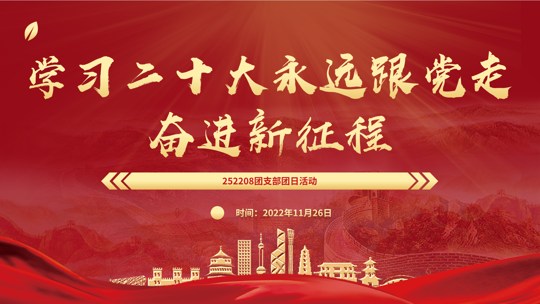 252208班团支部在团支书郭岳的带领下开展“学习二十大 永远跟党走 奋进新征程”主题团日活动,暨观看云团课并在课后进行体会分享。本次团日活动参与人员有支部内全体19名共青团员和8名班级成员。