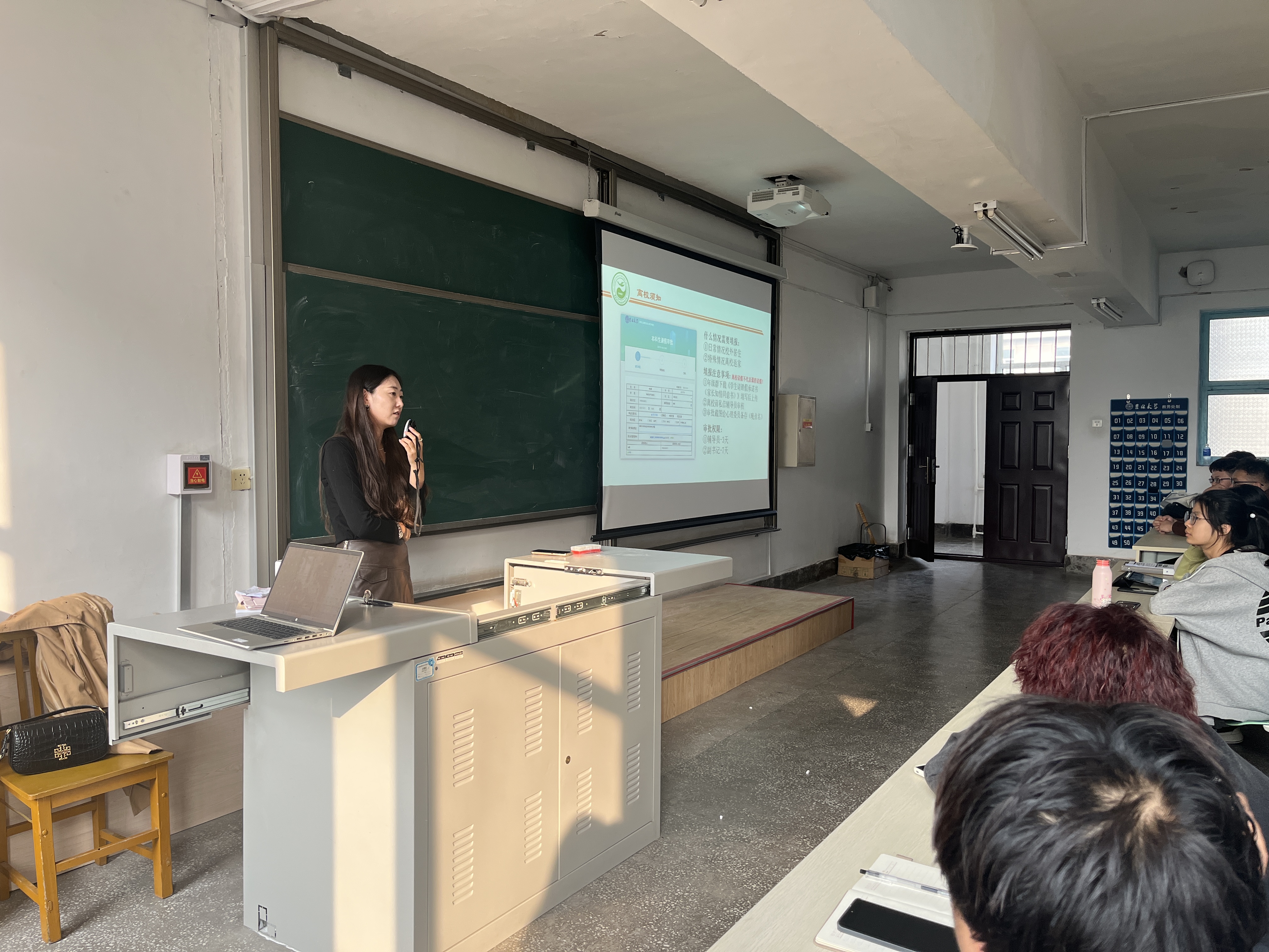 会议开始,李老师首先对本学期日常离校和课程请假相关事宜进行解答,明确日常离校请销假流程,提醒需要请假的同学在“网上办事大厅-本科生请假审批”处进行申报,上传《家长知情同意书》,辅导员老师审批后请假申请完成。其中,假条事假需家长致电沟通;除生病住院特殊情况外,学生有课时期事假不予批准。李老师强调离校请假不等同于课程请假,如无法按时上课学生本人需提前和任课教师请假,征得任课教师同意,否则为旷课。