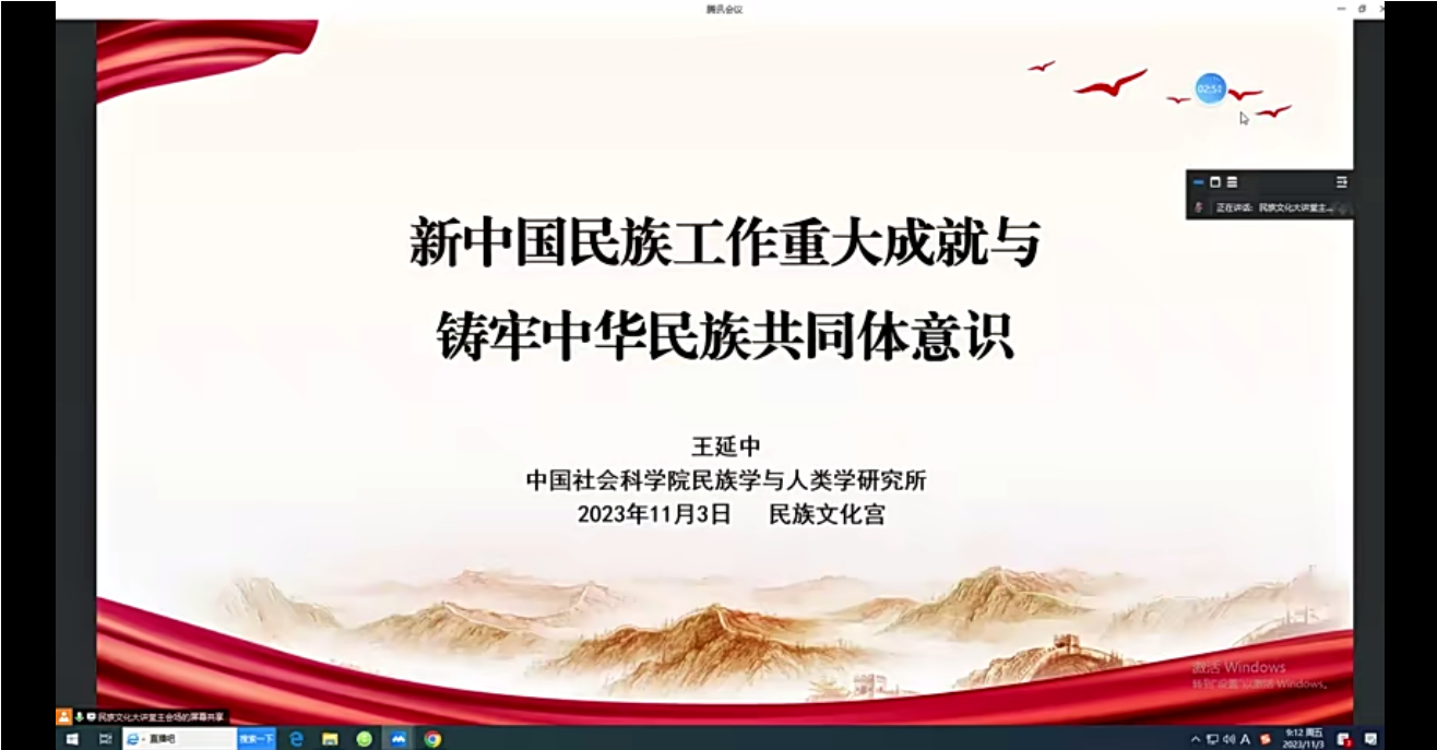 会议上,王延中教授详细讲解了我国成立以来民族工作的发展历程、主要举措、重大成就,将我国民族工作分为“建立民族区域自治制度和新型民族关系(政治建设为主)”、“推动共同团结奋斗、共同繁荣发展(加快经济发展)”以及“铸牢中华民族共同体意识(着力培育精神力量)”三个阶段,总结了第一阶段、第二阶段民族工作的教训与不足,指出了新时代我国民族工作面临的新挑战。随后,王延中教授通过介绍铸牢中华民族共同体意识的演进过程、战略意义,传达了推进铸牢中华民族共同体意识的总体要求及五项重点任务。