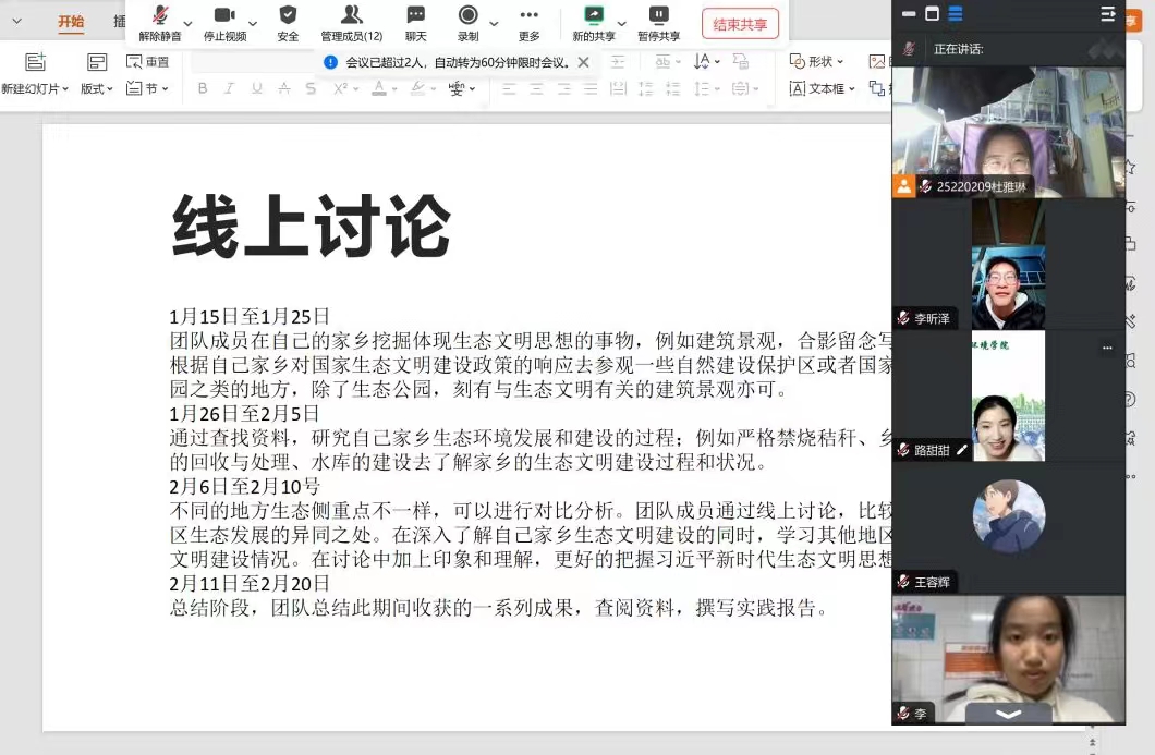 25日至214日期间,经过线上讨论,我们决定从加大自然生态系统和环境保护力度、加强生态文明制度建设、优化产业结构方面和提升公众生态文明素质方面这四个方面来研究,同时比较这些省份发展的异同之处。我们将实践队员分为三组,分别负责这四个方面的内容。查找资料后,队员将其整理归纳,并编辑日志的内容,上传总结。