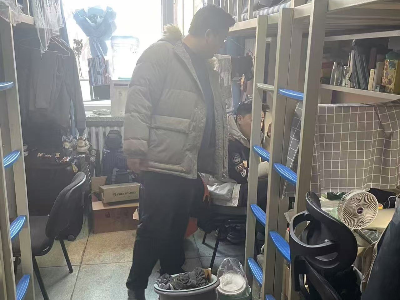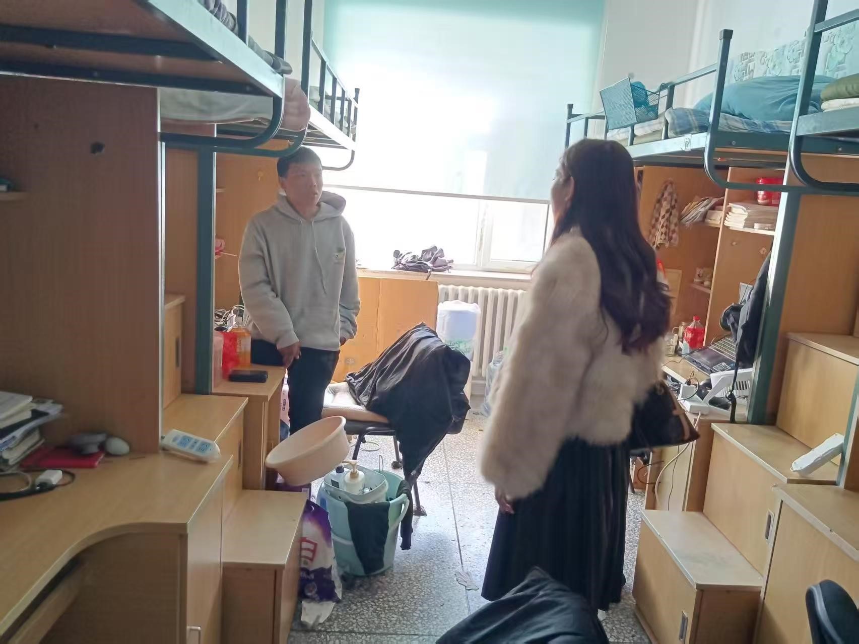 2月24日,2021级辅导员李薇老师进入朝阳五公寓、朝阳七公寓学生对学生考研初试情况进行摸排,对寝室卫生、消防安全进行检查。