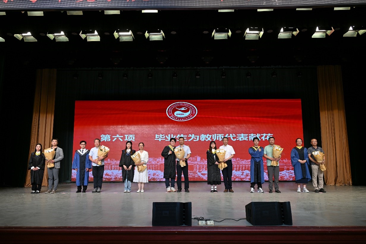 关于授予2024届毕业生学位的决定》,主礼教授许天福教授、李鸿雁教授、郑娜教授、卞建民教授、花修艺教授、董军教授为319名毕业生授予学位、拨动流苏。学位授予仪式后,毕业生代表为优秀毕业论文指导教师献花,感谢老师们的辛勤付出。副院长徐军为2024届校友年级理事颁发聘书,呼吁校友们持续关注学校和学院发展,为母校建设建言献策。
