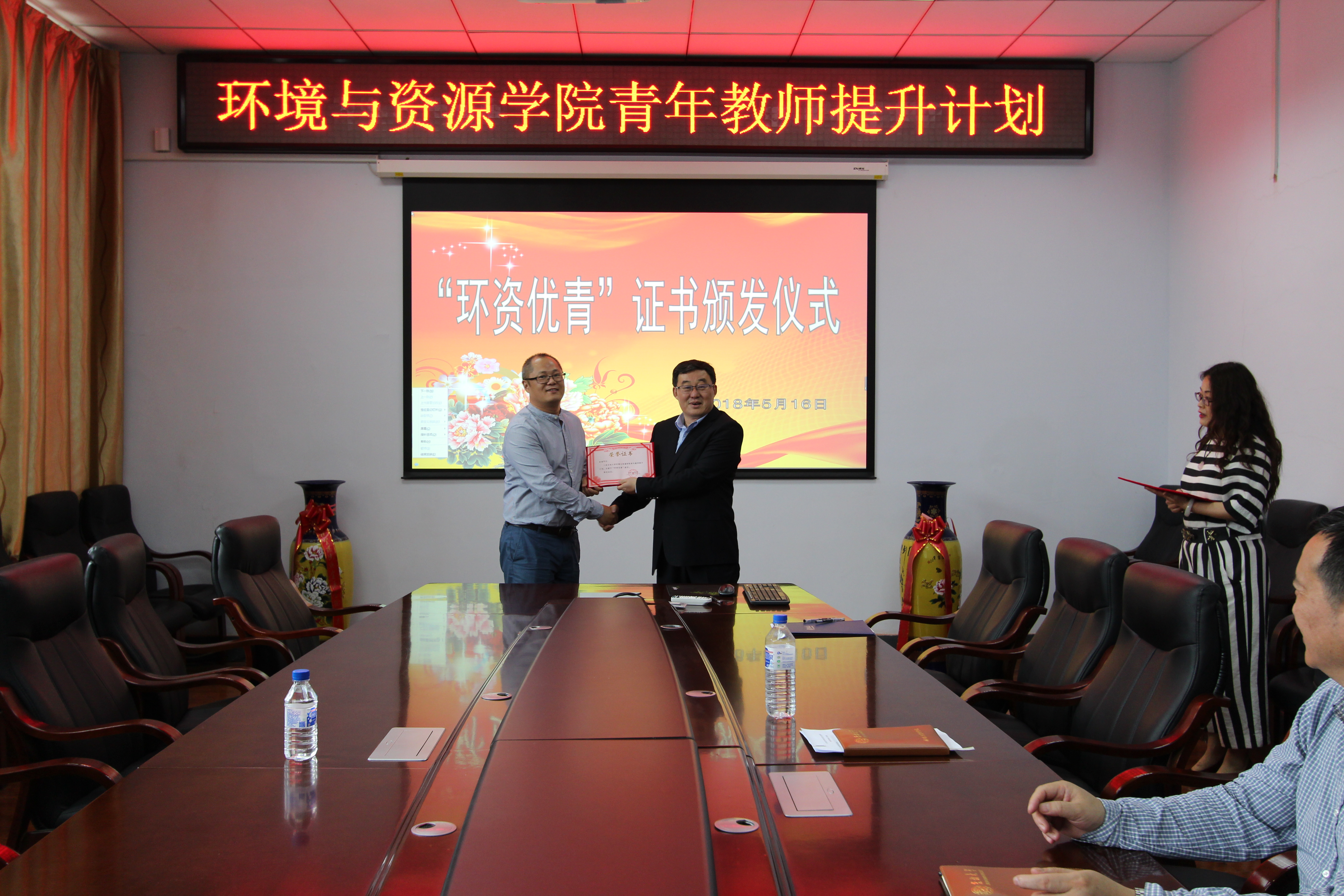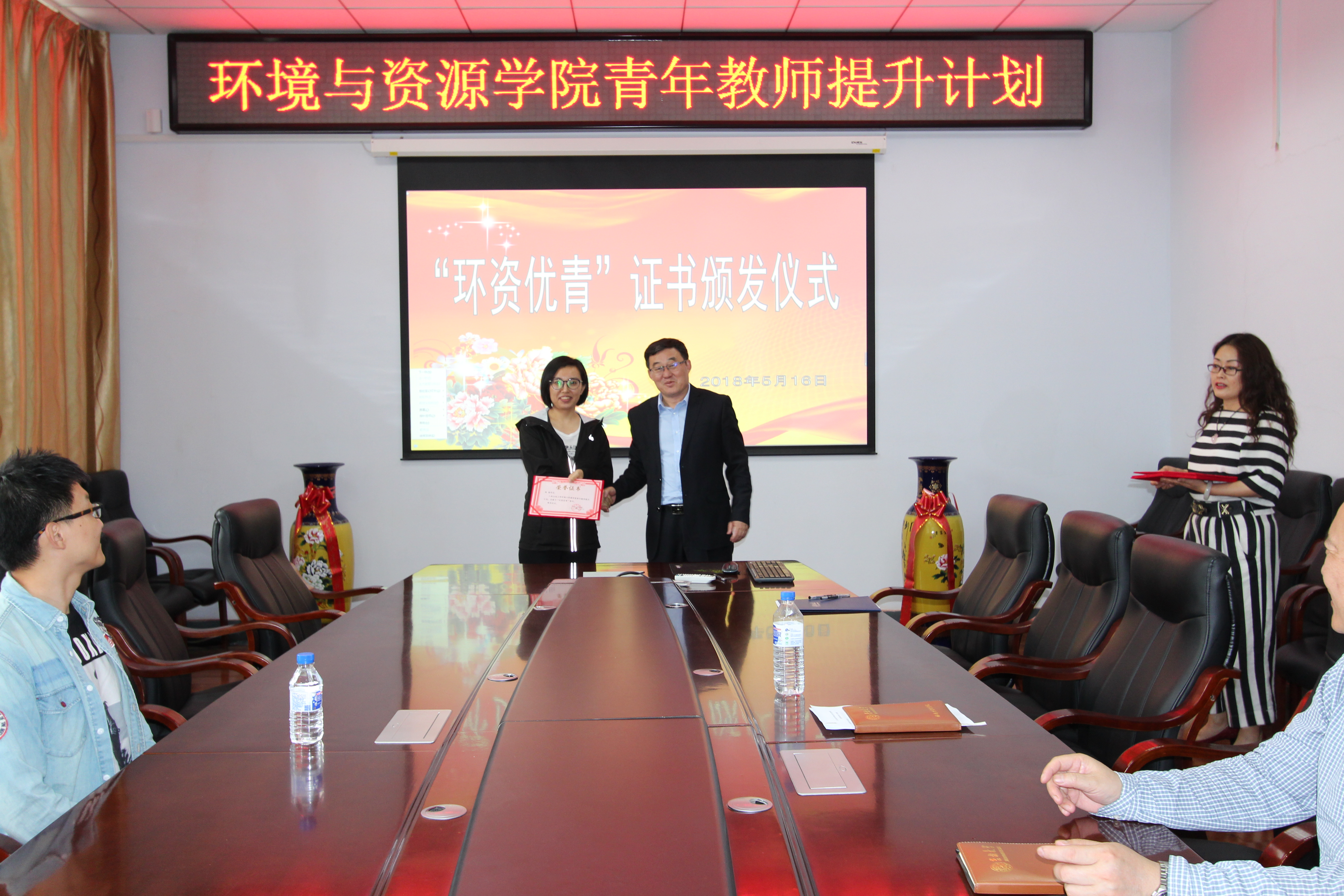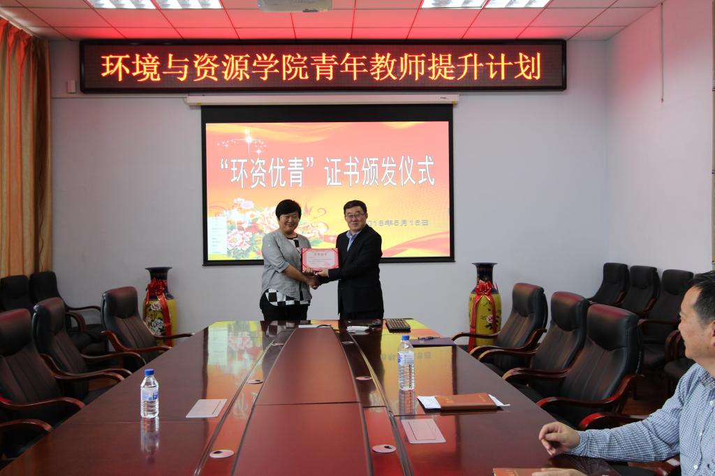 环境与资源学院青年教师提升(简称“环资优青”)计划》的工作安排5月16日下午,环境与资源学院在北区理化楼260会议室,举行了2018年度“环资优青”证书颁发仪式。学院班子和学院2018年度“环资优青”获得者参加了证书颁发仪式。仪式由分管科研的花修艺副院长主持。