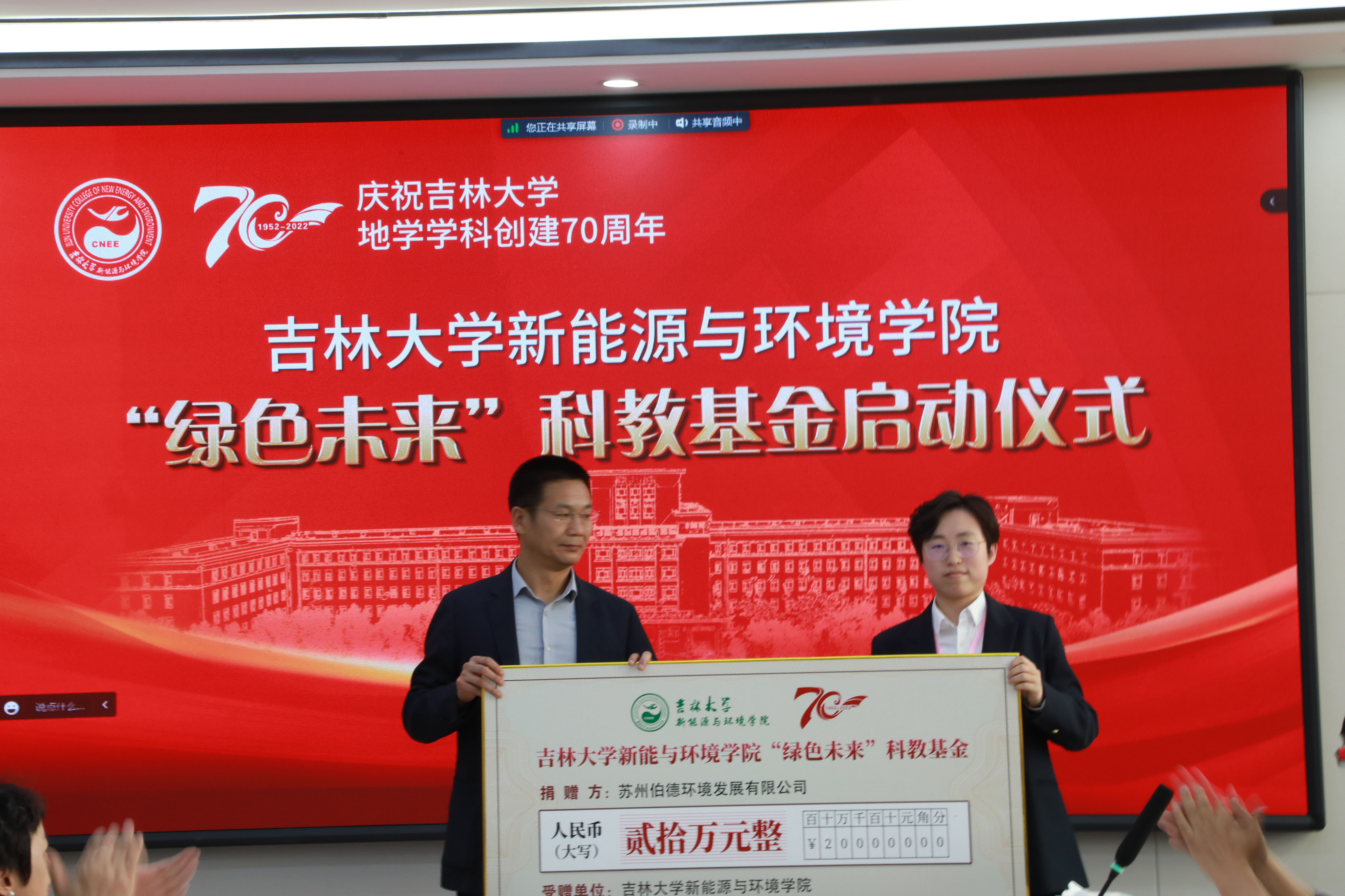 地学学科暨原长春地质学院创建70周年庆祝大会,学院举办系列庆祝活动,全院师生员工、海内外校友和关心学院发展的各界人士相聚线下线上,齐襄盛典,畅叙师生情谊,回顾了70年来学院在人才培养、科学研究、社会服务、文化传承创新和国际交流合作等方面取得的丰硕成果。以此为契机,学院校友捐赠设立“绿色未来”科教基金,举行了科教基金启动仪式。该基金将用于奖助学金、优秀人才培养等。