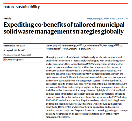 宋俊年教授、杨巍副教授领衔的“食物农业生物质(FAB)”研究团队在城市固废可持续管理领域取得突破性成果,以“Expediting co-benefits of tailored municipal solid waste management strategies globally”为题在《Nature Sustainability》发表研究长文。博士生曹琪林为论文唯一第一作者,宋俊年教授、杨巍副教授、伦敦大学学院米志付教授为共同通讯作者,嗨皮漫画