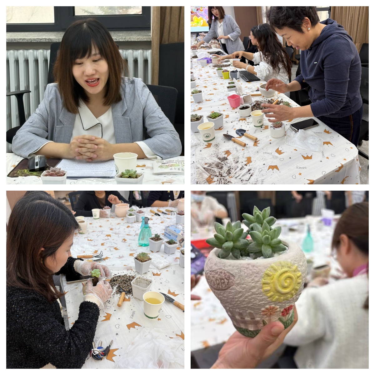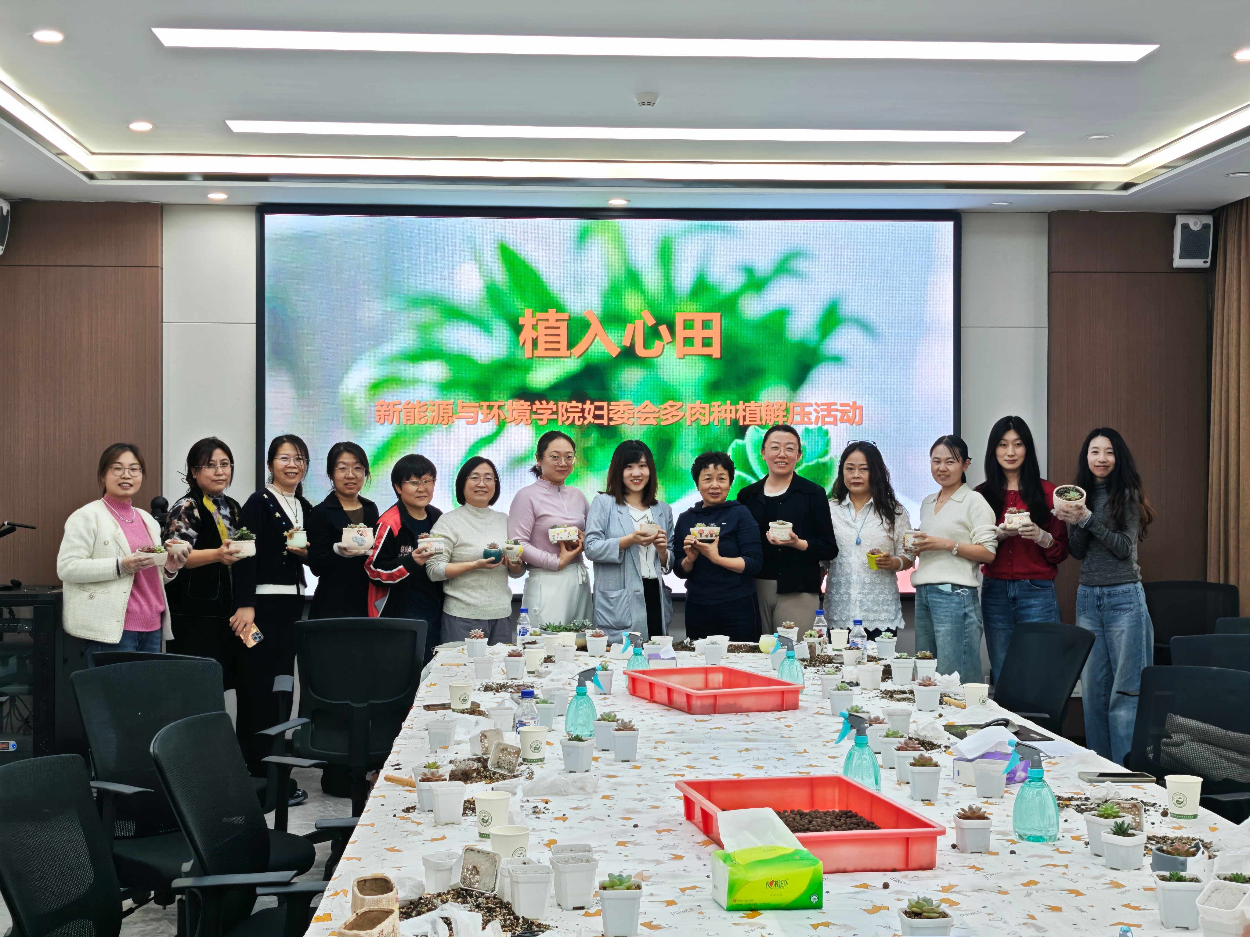 在多肉植物种植环节,学院提前准备了花土、陶粒、白石子及各类园艺工具。兰岚老师现场示范种植技巧,教职工们亲手栽种属于自己的多肉盆栽。活动现场欢声笑语,一盆盆生机勃勃的多肉植物在老师们手中焕发出活力。