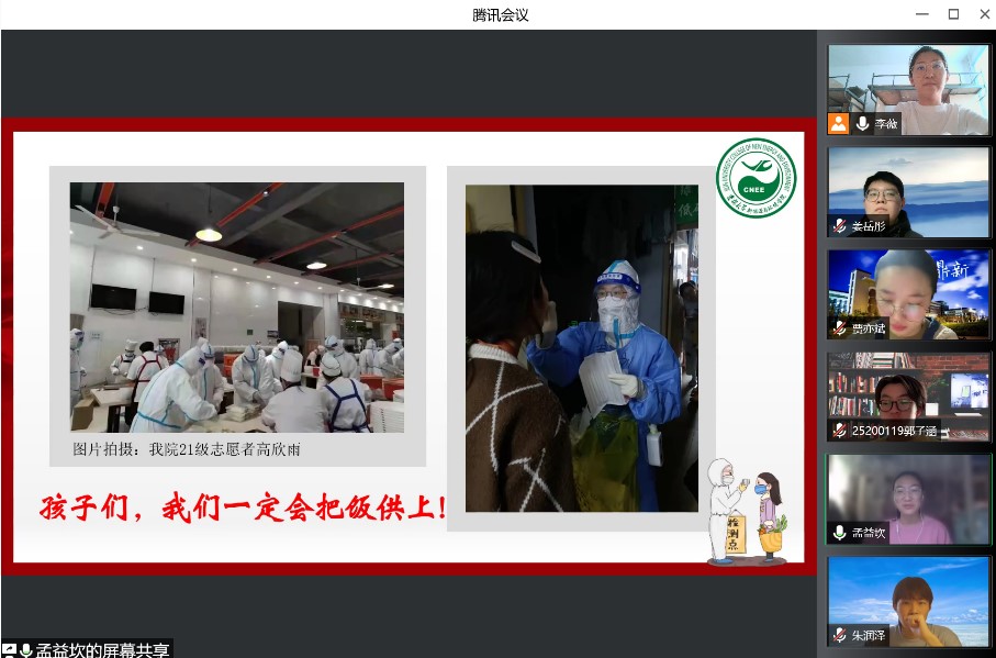 活动伊始,党支部组织委员兼宣传委员牛梦圆同学带领大家一起学习了《致全省各级党组织和广大共产党员的一封信》以及《致全校各级党组织和广大党员的倡议书》。随后,四位党员志愿者代表分别分享了自己的战疫故事。孟益坎同学向大家展示了几组图片,讲述了自己从看到老师同学们积极参与疫情防控到自己和室友们一起参与防控的故事,分享了自己在清晨为大家发放完早餐后获得的自豪和光荣。她用“聚是一团火,散是满天星”形容一直奋战在校园疫情防控第一线的志愿者。一直驻校工作的钟宇博老师也分享了他这段时间的工作感受,他最后说“我们终会在春暖花开的校园里,迎接嗨皮漫画